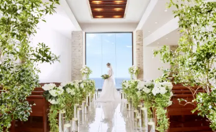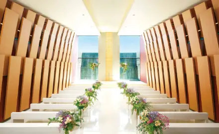 近鉄四日市駅から徒歩3分とアクセス抜群。人気のスカイバンケット『ラ・メール』は、昼間は伊勢湾から鈴鹿山脈が眺め、夜は四日市市内の夜景が楽しめる最高のロケーション。スカイチャペルとしての利用も可能で、地上70mでの挙式・披露宴はイチオシ。