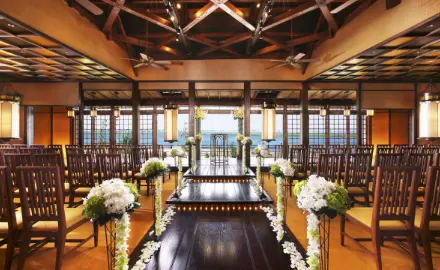 四日市の名士の旧邸が醸し出す歴史の趣。そして現代の華やかさが融合した2つのパーティ会場と海が見えるチャペルを併設。過去と現在が見事に融合した空間で、広大な海に幸せを誓い、美食でゲストをもてなせる。「上質」を愉しむ大人のウエディングにふさわしい場所。