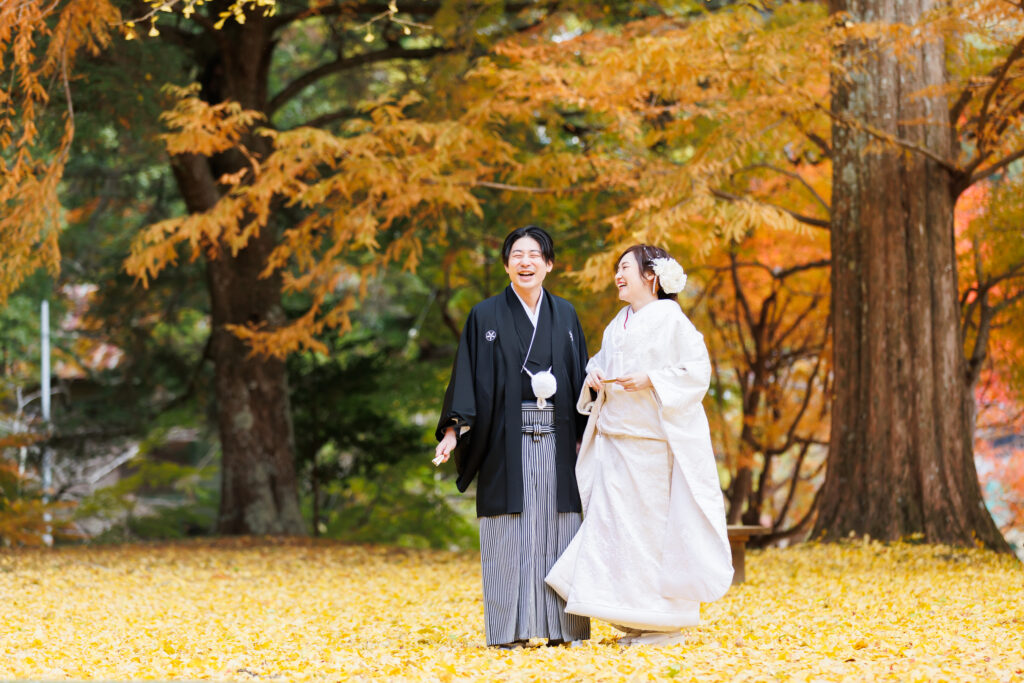 お式の前日には、色打掛での前撮りを行いました。黄金色に輝く銀杏の絨毯や、色鮮やかに色づいた庭園を背景に、時間をかけてゆっくりと撮影。11月ならではの最高のロケーションの中、おふたりの幸せ溢れる表情をたくさん収めることができ、とても印象深い時間となりました。