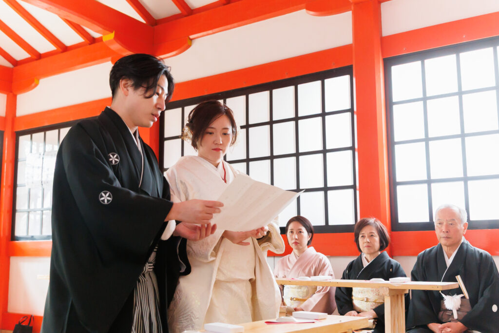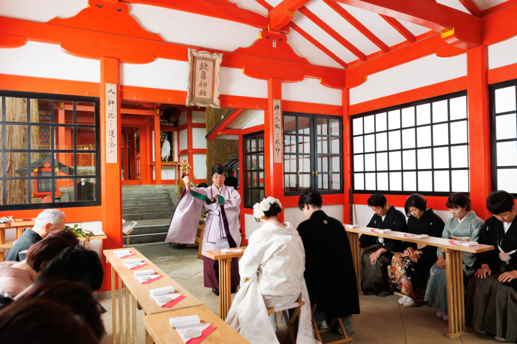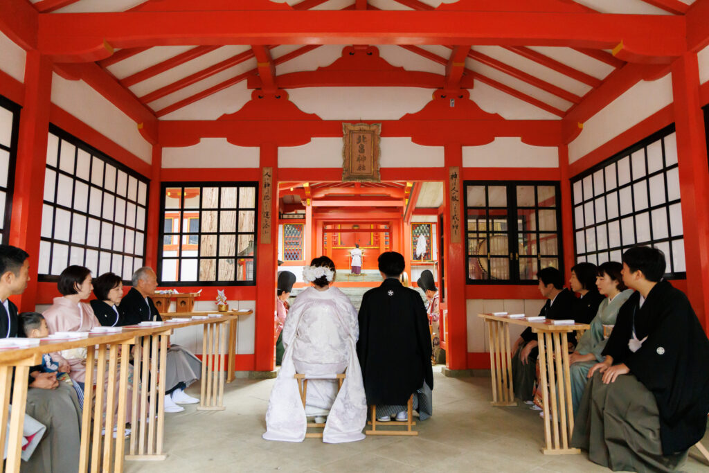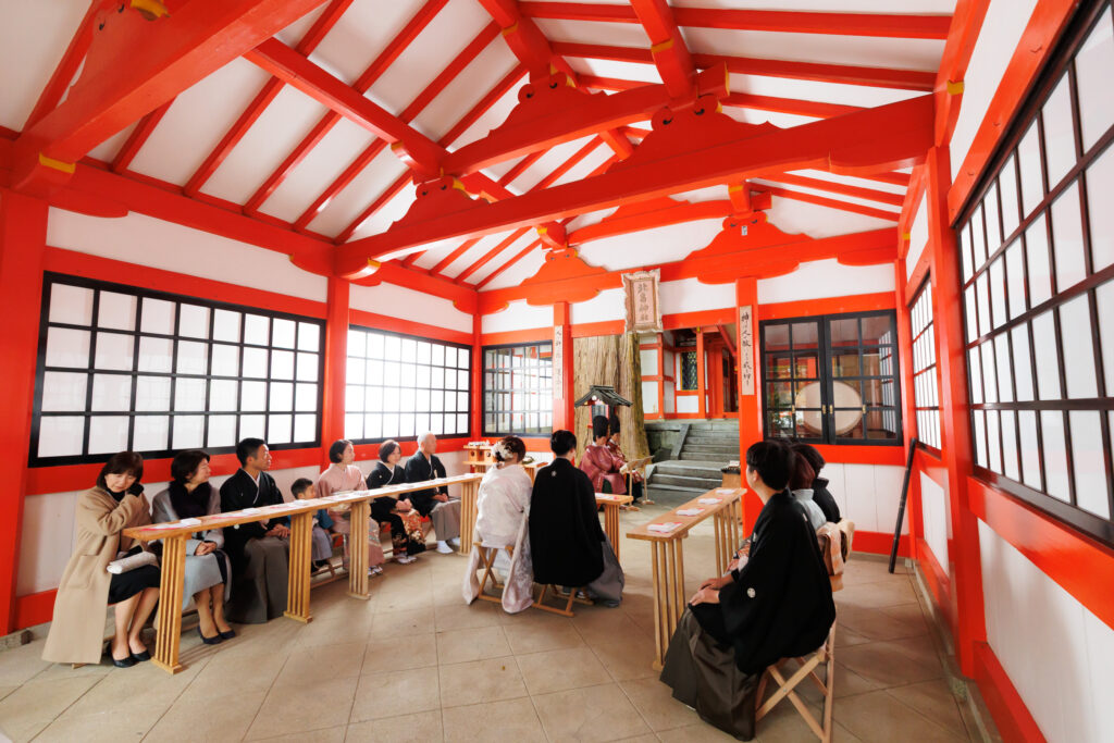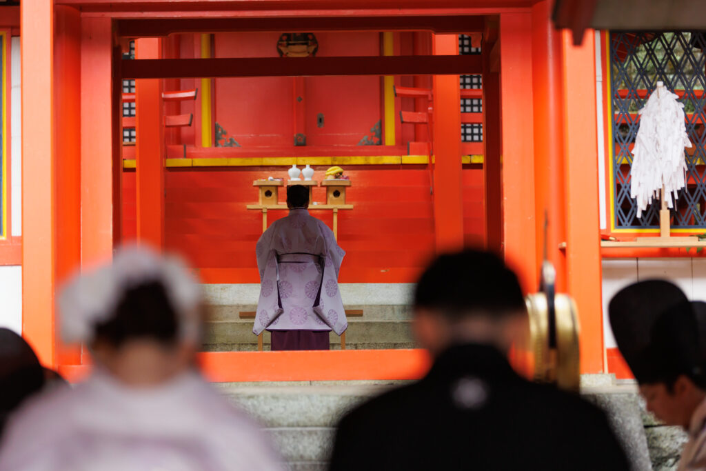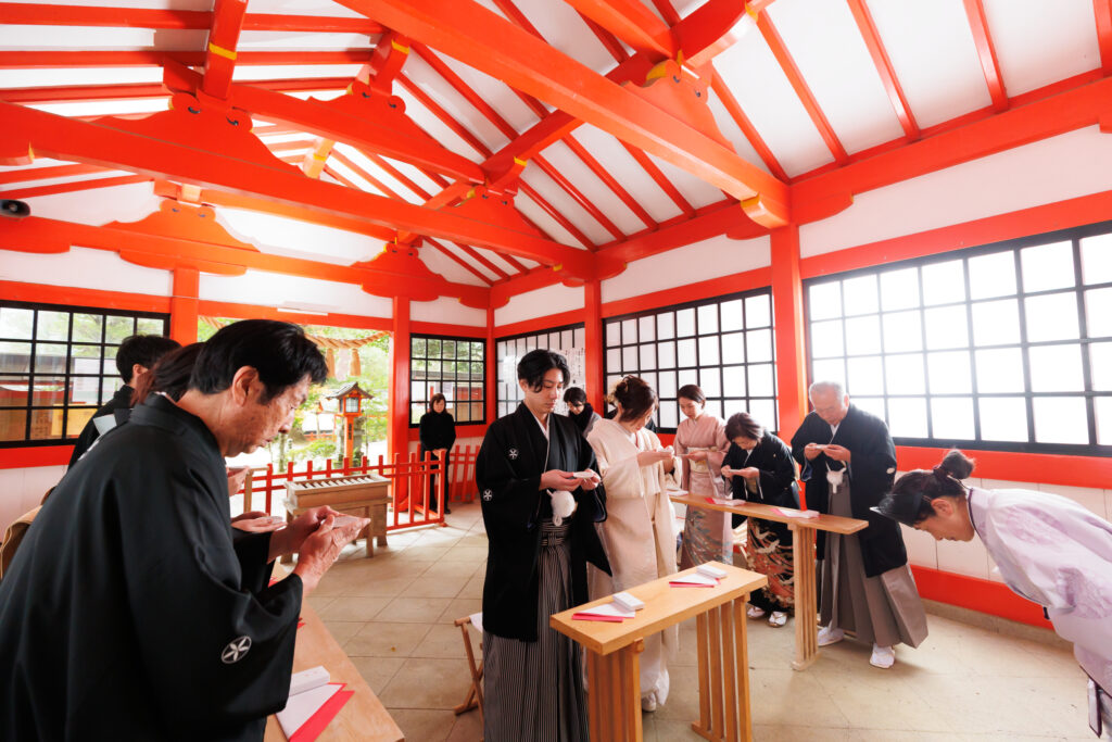 挙式当日は、ご家族の皆様も揃って和装をお召しになり、雅楽の演奏が響き渡るなか、全員でゆっくりと歩まれる「参進」の儀をされました。凛とした空気のなかで絆を深められるお姿は、前日の華やかな雰囲気とはまた違う、厳かで温かい感動に包まれていました。