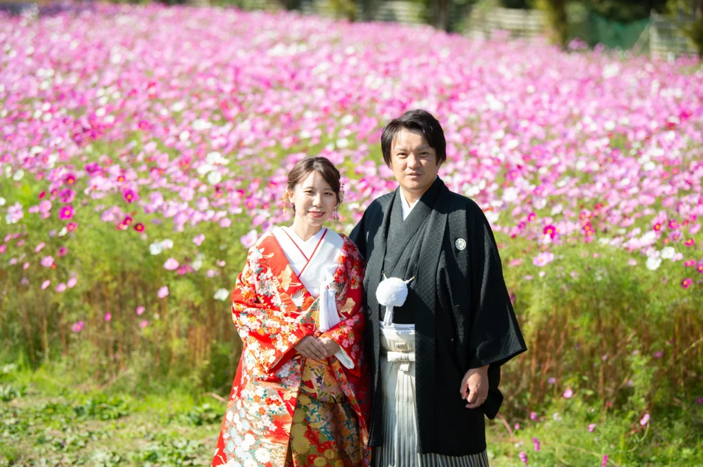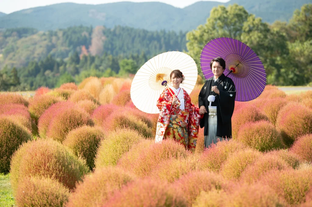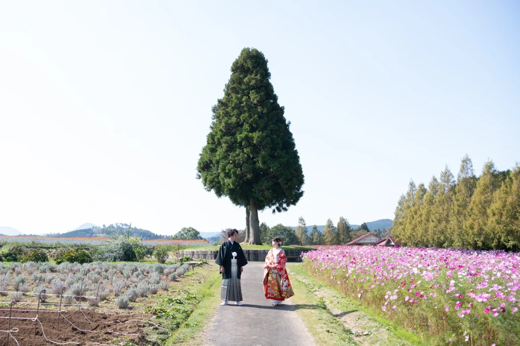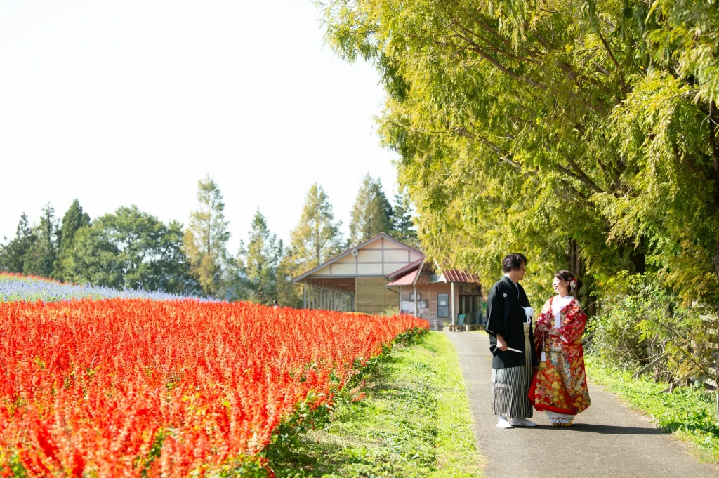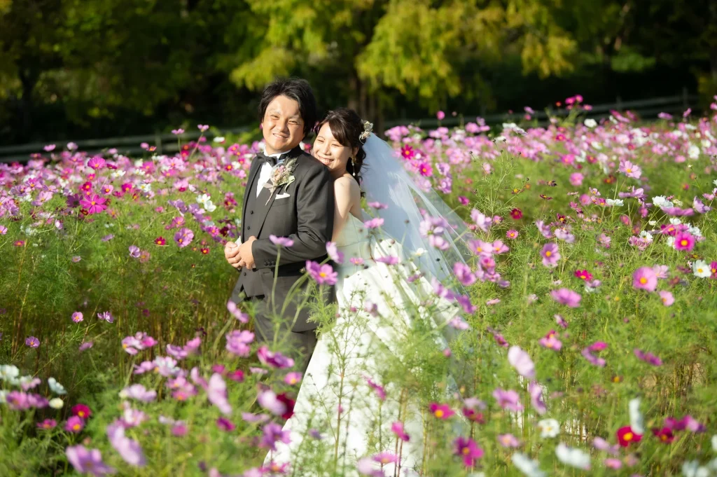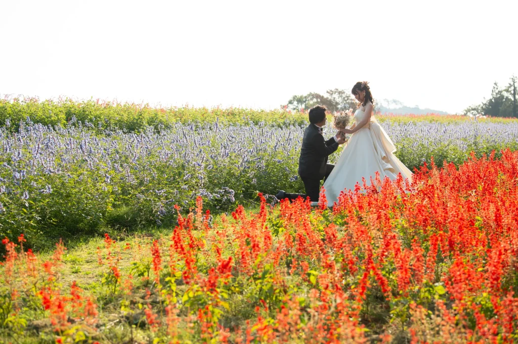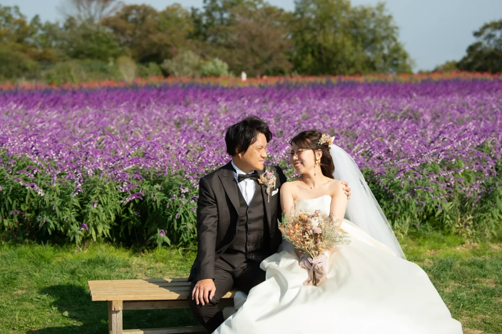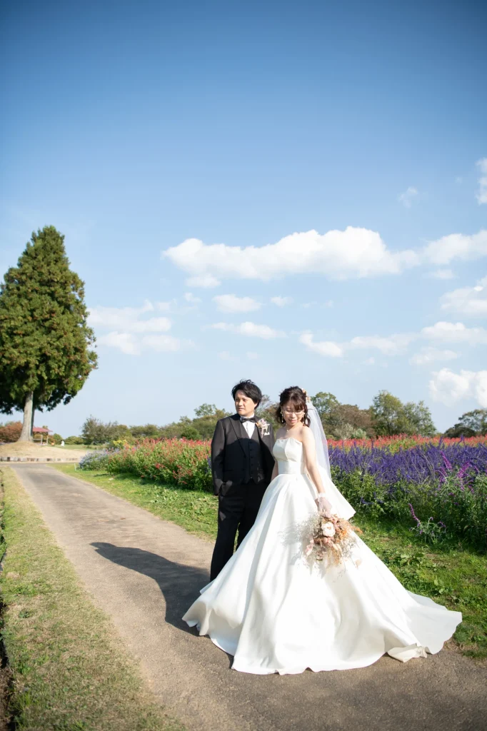 お花が大好きな新婦様が前撮りのロケーションに選ばれたのは、三重県伊賀市にある「メナード青山リゾート」。標高600mに位置し、100万坪の広大な敷地を誇る自然豊かなリゾート地です。今回の撮影では、色とりどりの可憐な花々に囲まれたハーブガーデンにて撮影を実施。年間300種類以上のハーブが育つこのガーデンでは、花やハーブの摘み取り体験もでき、五感で自然を感じられる特別な場所です。青空と緑の大地、そして鮮やかな山々が織りなす風景は、ドレス姿のおふたりをより一層美しく引き立ててくれました。メナード青山リゾートならではの澄んだ空気と心癒される香りの中で、リラックスした雰囲気のまま自然体で撮影が進み、笑顔あふれる素敵な時間となりました。花に囲まれた前撮りやフォトウエディングをお考えの方には、四季折々の彩りが楽しめるこのロケーションはぜひおすすめです。