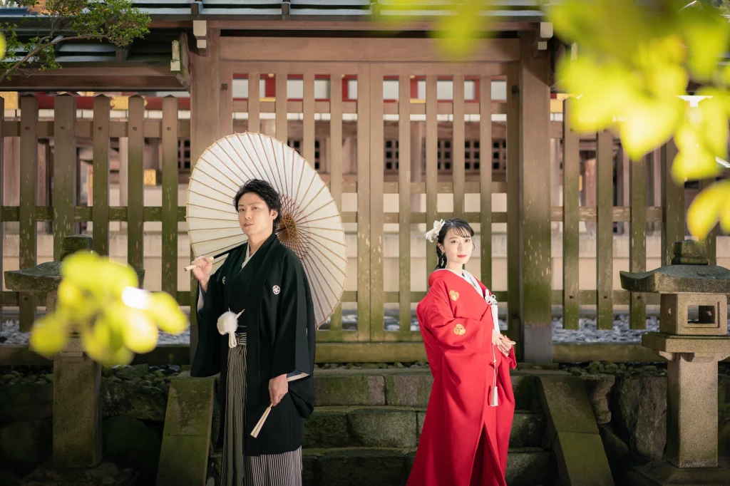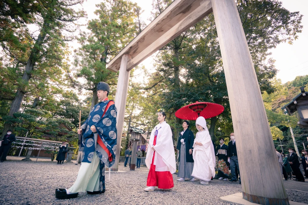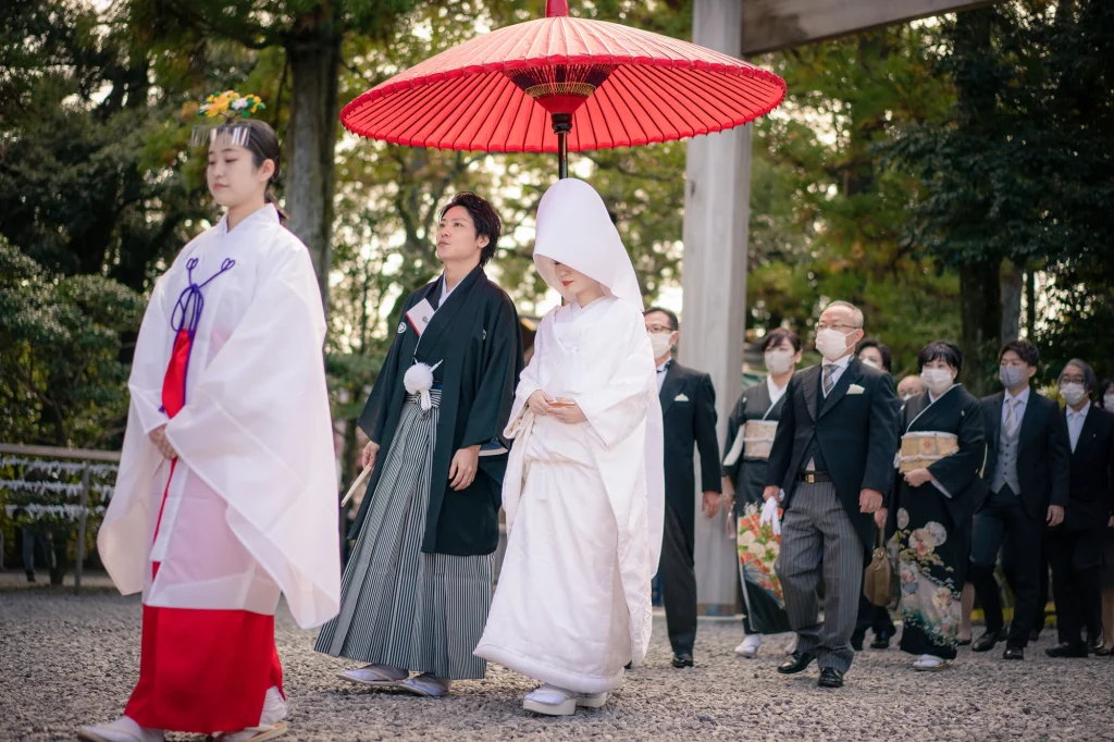 新婦様のご実家がある三重県志摩市で、白無垢のお支度から始まった結婚式当日。ご近所の方々やご友人、懐かしい同級生や恩師までが駆けつけてくださり、「おめでとう!」の声が街にあふれる、温かな祝福の時間となりました。その後は花嫁車に乗って伊勢市の猿田彦神社へ。厳かな雰囲気の中で執り行われた神前式では、ご家族と大切な方々に見守られながら、凛としたお姿で誓いを交わされました。挙式後は、華やかな色打掛にお着替えをし、神社周辺の風情あるロケーションで撮影を実施。伝統と感謝、そして地域の人々とのつながりを感じる、心温まる一日となりました。三重・志摩・伊勢で和婚をお考えの方に、ぜひ参考にしていただきたい一例です。