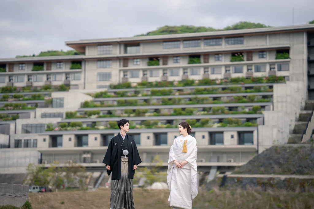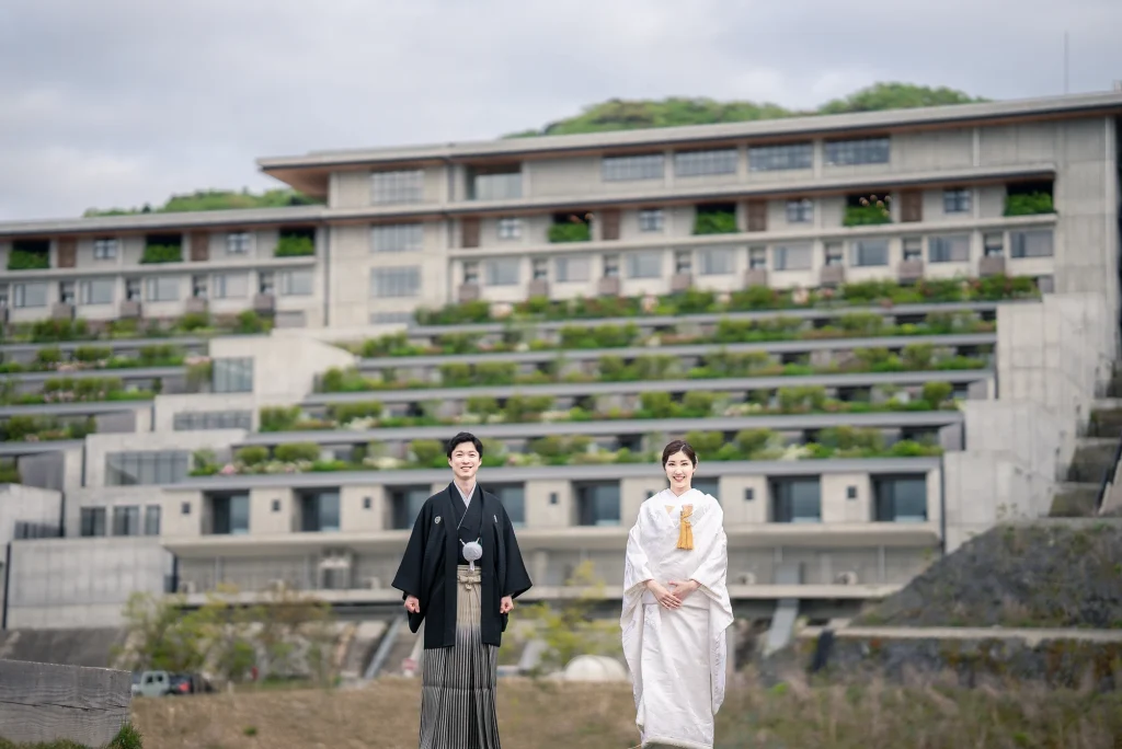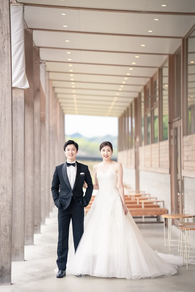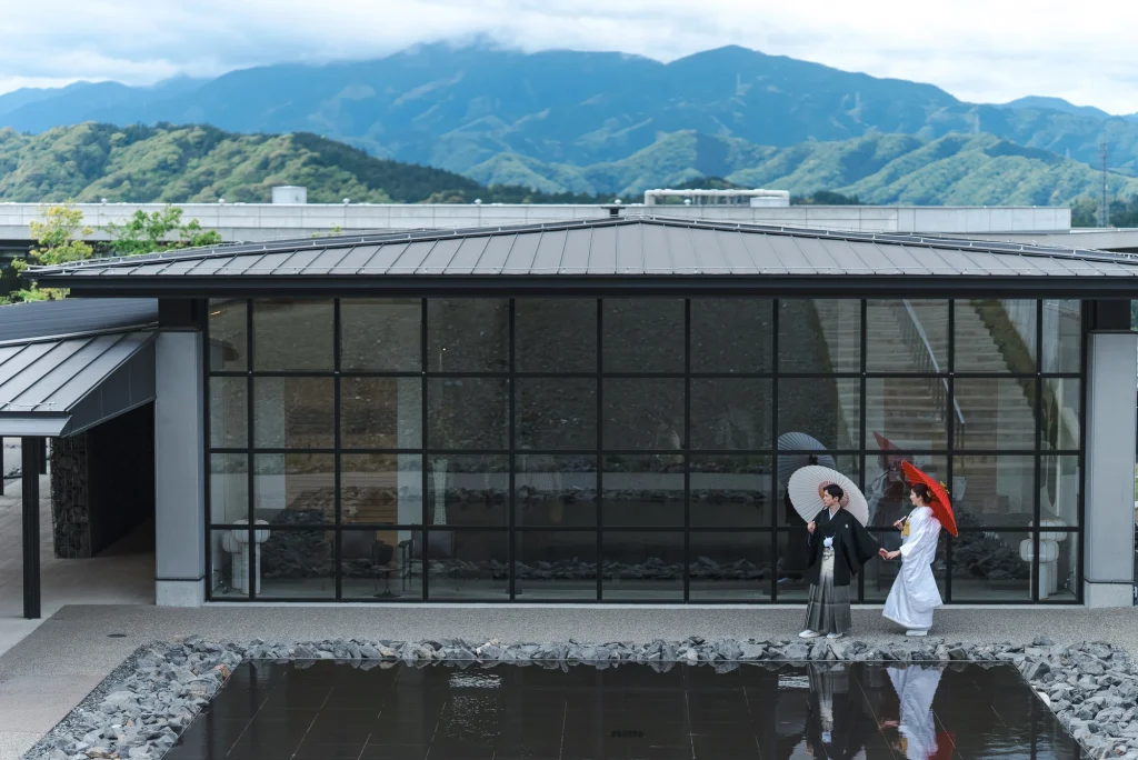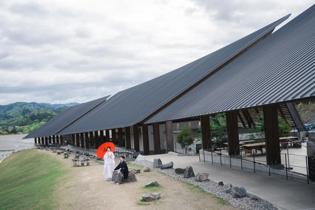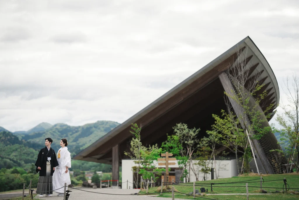 「旅先で一生の思い出に残るフォトウエディングを」というご希望からご提案させていただいたのは、多気町にある日本最大級の商業リゾート「VISON(ヴィソン)」。東京ドーム24個分もの広大な敷地には9つのエリアが広がり、その中でも今回撮影を行った「マルシェ ヴィソン」は、世界最大級の国際デザインコンペティションでも受賞歴を持つ注目のスポットです。今回は白無垢、ウエディングドレス、カラードレスの3種類のお衣裳でロケーション撮影を実施。和の雰囲気とモダンさが調和した空間は、どのお衣裳にもぴったりで、おしゃれで洗練されたフォトウエディングが叶いました。自然・建築・文化が融合するVISONは、非日常感とスタイリッシュな雰囲気が魅力。三重県でフォトウエディングをご検討の方には、バリエーション豊かな撮影が楽しめるVISONでの撮影を心からおすすめします。
