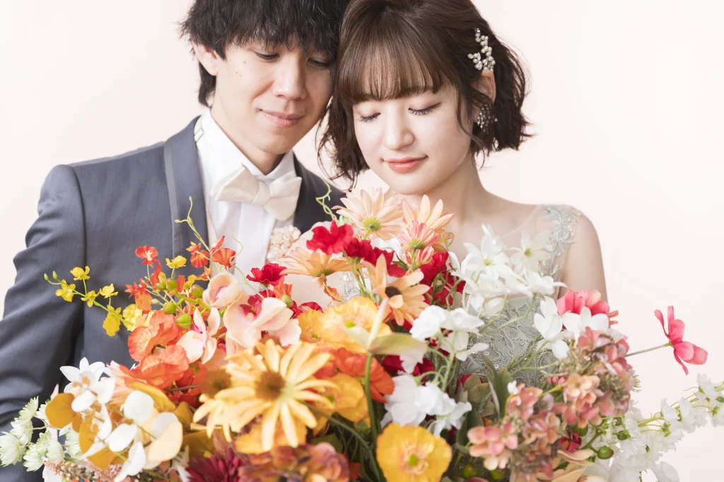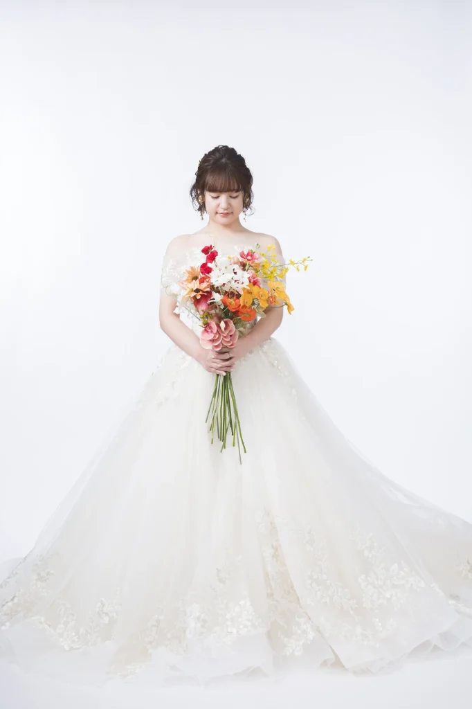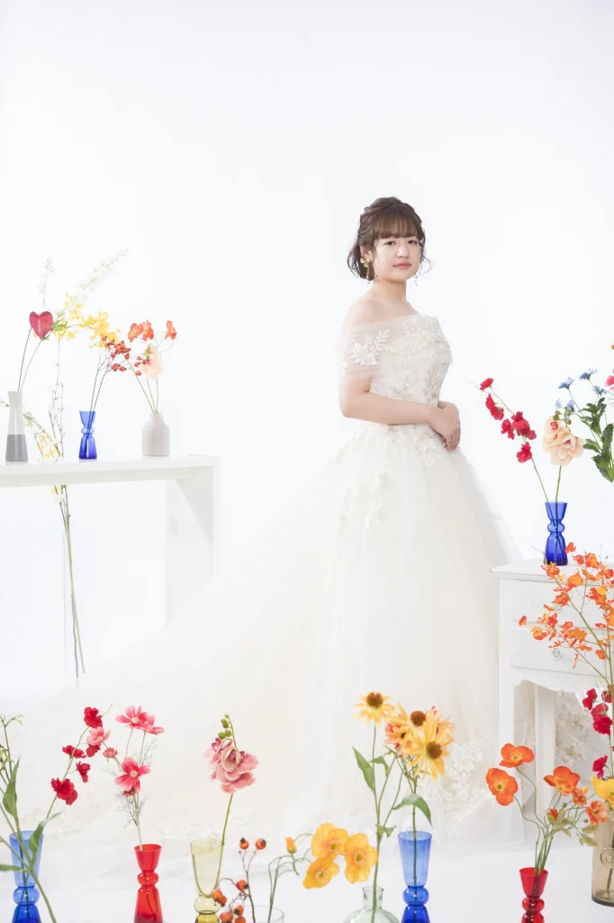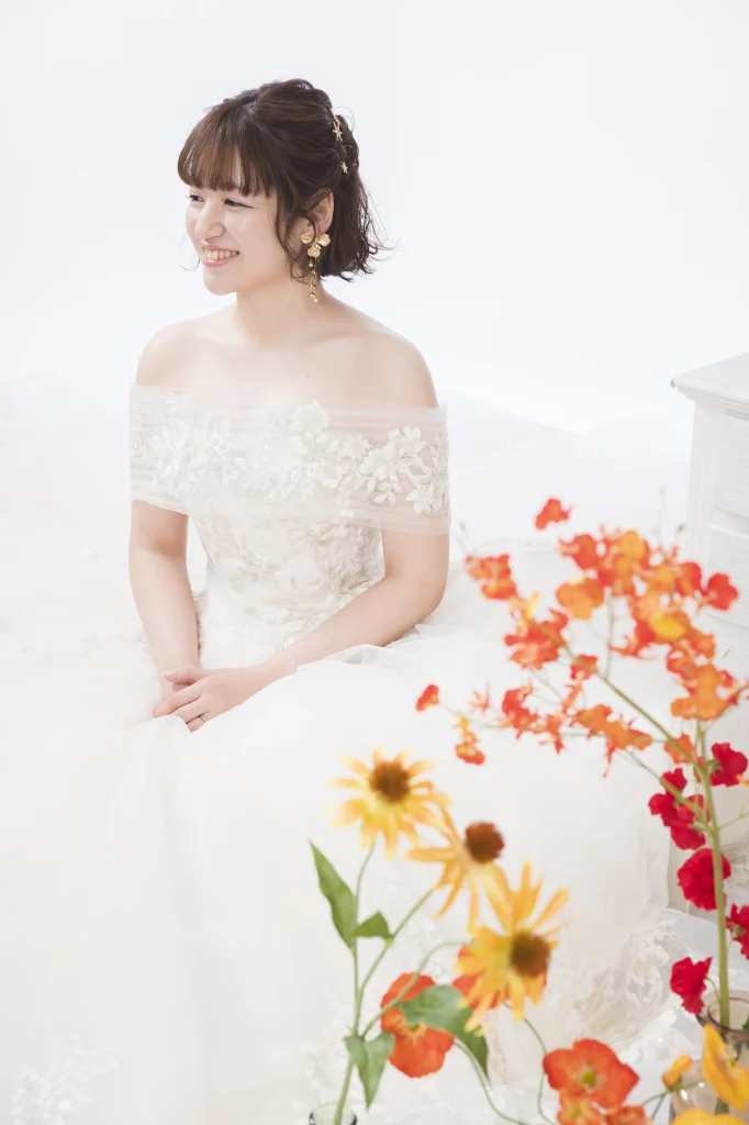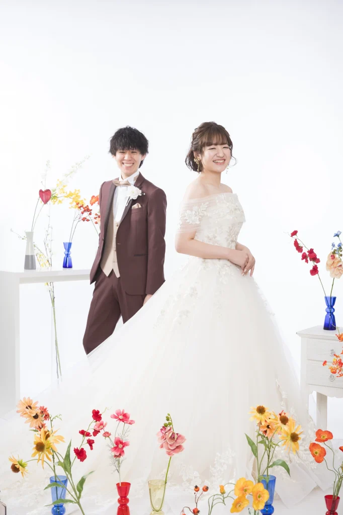 とっても可愛らしい新婦様と、優しくそっと寄り添う新郎様。おふたりのご希望は「お花に囲まれた写真」と「衣裳にとことんこだわること」。その想いを形にするため、春に新たに入荷した季節の花々を、おふたりの雰囲気や選ばれた衣裳に合わせて丁寧にコーディネートいたしました。華やかで温かみのある空間の中、自然と笑顔があふれる撮影に。衣裳は、創業72年の歴史を持つ「すぎしん衣裳店」より、ドレス・和装合わせて3,000点以上のラインナップからお選びいただき、理想のスタイルを実現されました。衣裳もロケーションもこだわり抜いた、まさに“おふたりらしさ”が詰まったフォトウエディングとなり、見る人の心にも残る1日となりました。衣裳もお花もとことんこだわりたい方におすすめの撮影プランです。