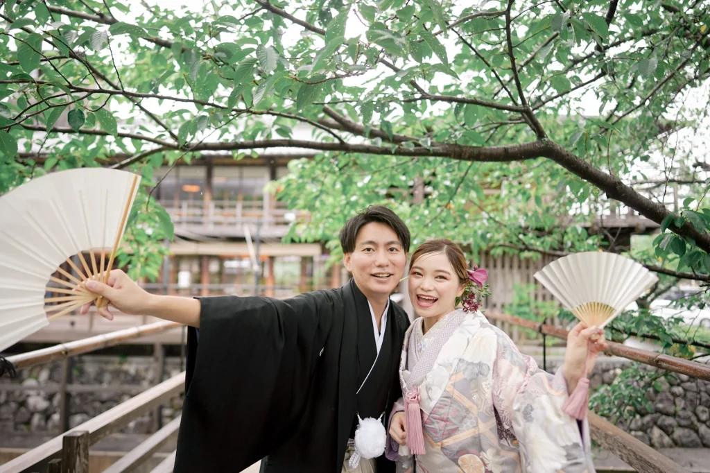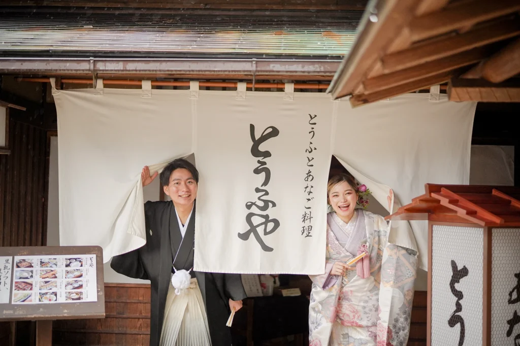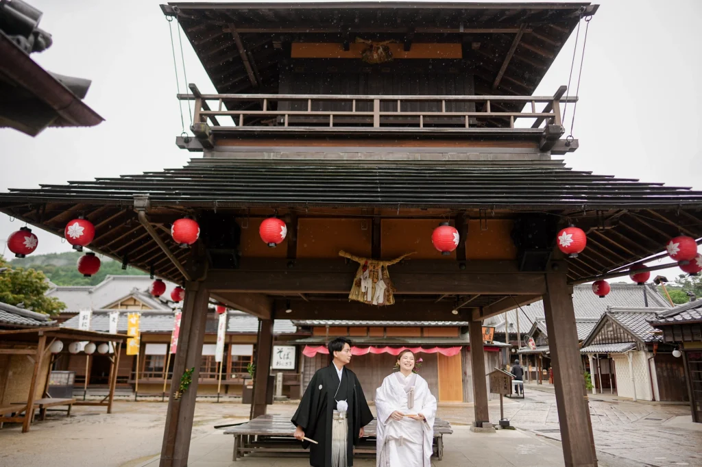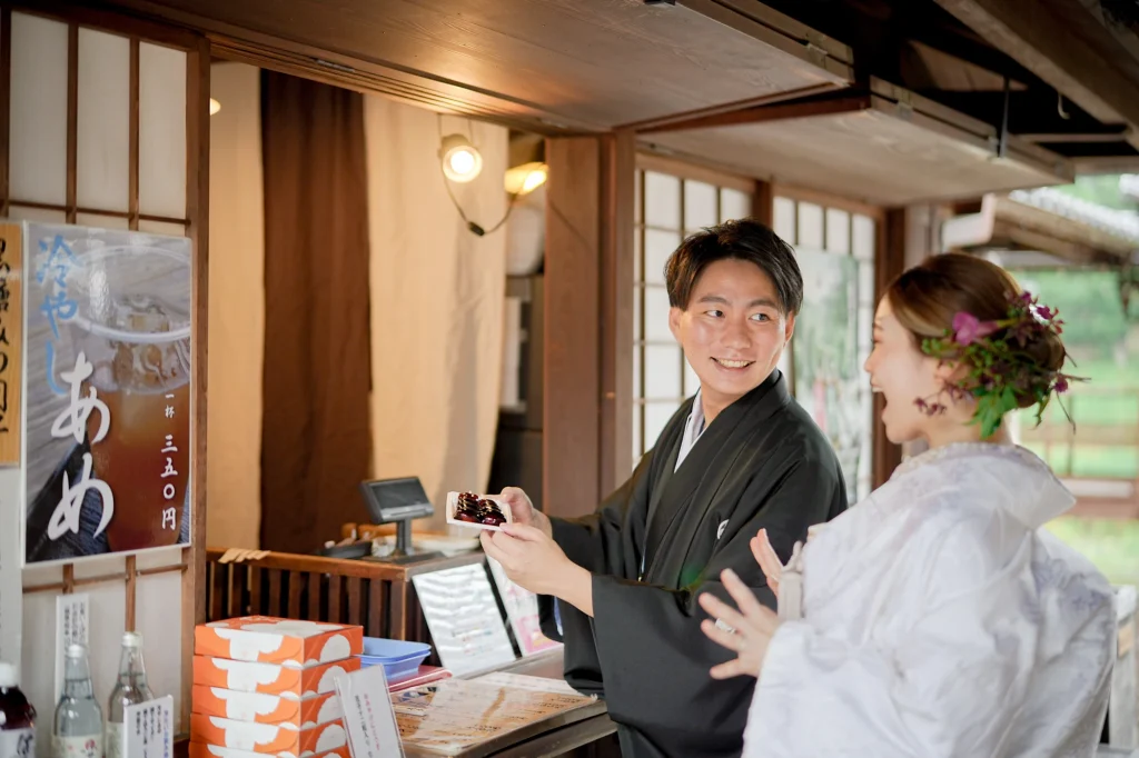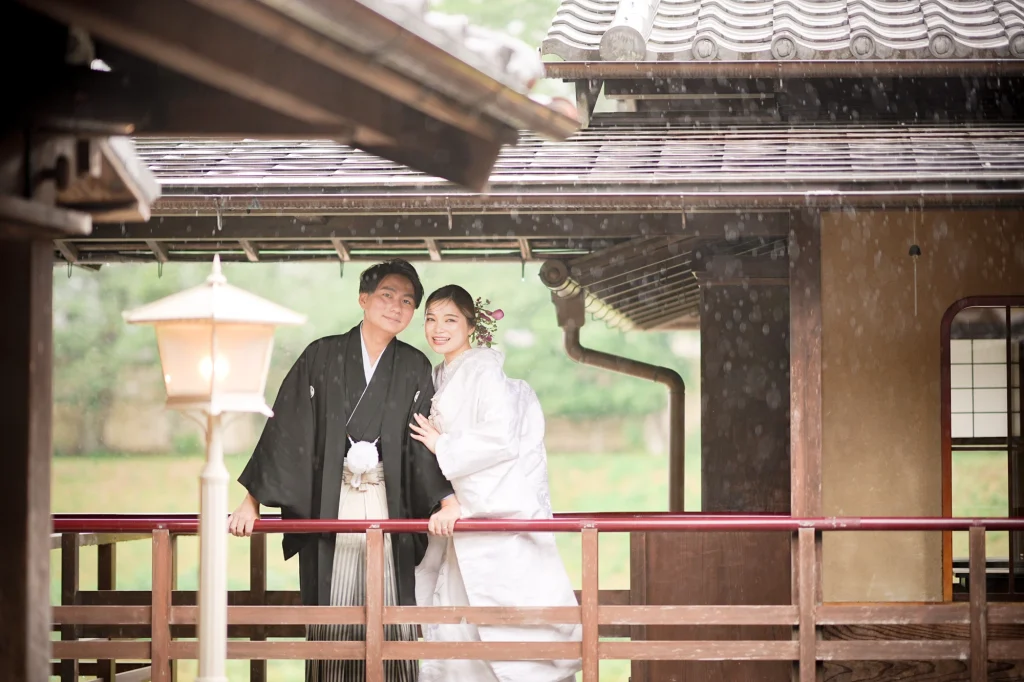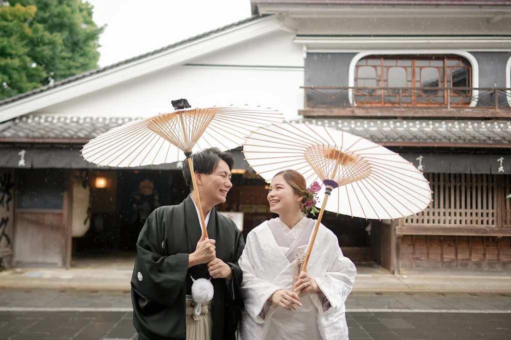 関東からお越しのおふたりは、東京での結婚式前に、思い出の場所・三重県伊勢市で前撮りと伊勢神宮への入籍奉告参拝を実施。当日は雨模様でしたが、雨粒をまとったしっとりとした空気がかえって写真に深みを与え、おふたりの元気で笑顔あふれる姿が一層際立ちました。まずは大好きなおかげ横丁での前撮り。江戸・明治期の情緒ある町並みを背景に、観光客からも祝福される中、和装も洋装も自然体の笑顔で撮影。町全体が祝福ムードに包まれました。その後、神聖な境内で執り行われた伊勢神宮内宮での入籍奉告参拝は、日本人の“心のふるさと”である伊勢神宮ならではの癒しと格式を感じられる儀式です。雨の日でも、自然の緑と雨のしずくが織り成す穏やかで神秘的な雰囲気が、おふたりの節目をより静かに美しく演出しました。和装前撮りや、天候を味方にするロケーション撮影、そして伊勢神宮での奉告参拝を織り交ぜたこのプランは、「伊勢神宮 入籍奉告参拝」「おかげ横丁 前撮り」「雨の日 前撮り 和装」といったキーワードで検索するカップルにぜひおすすめです