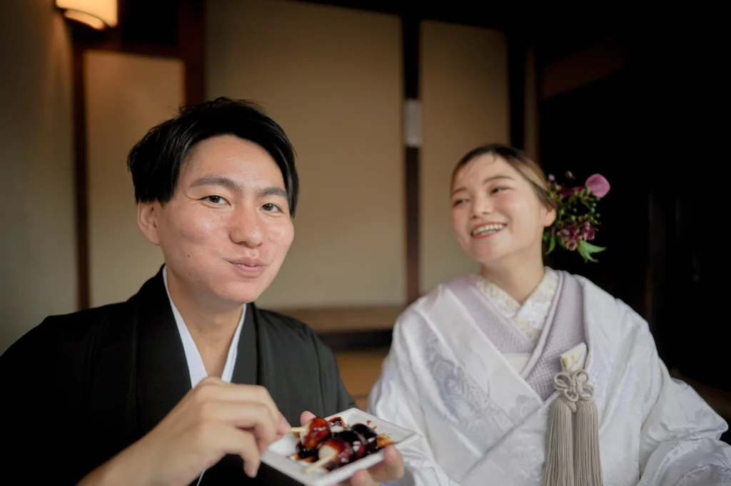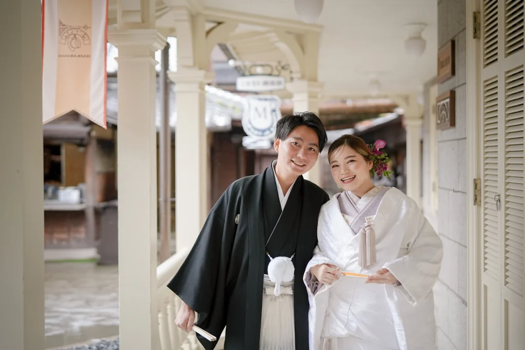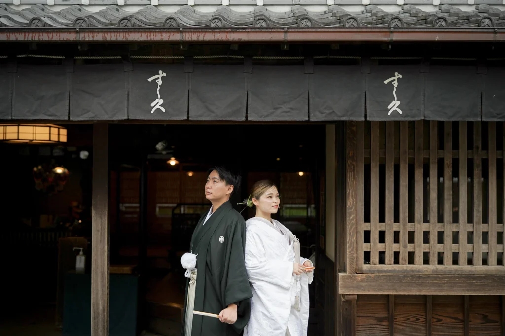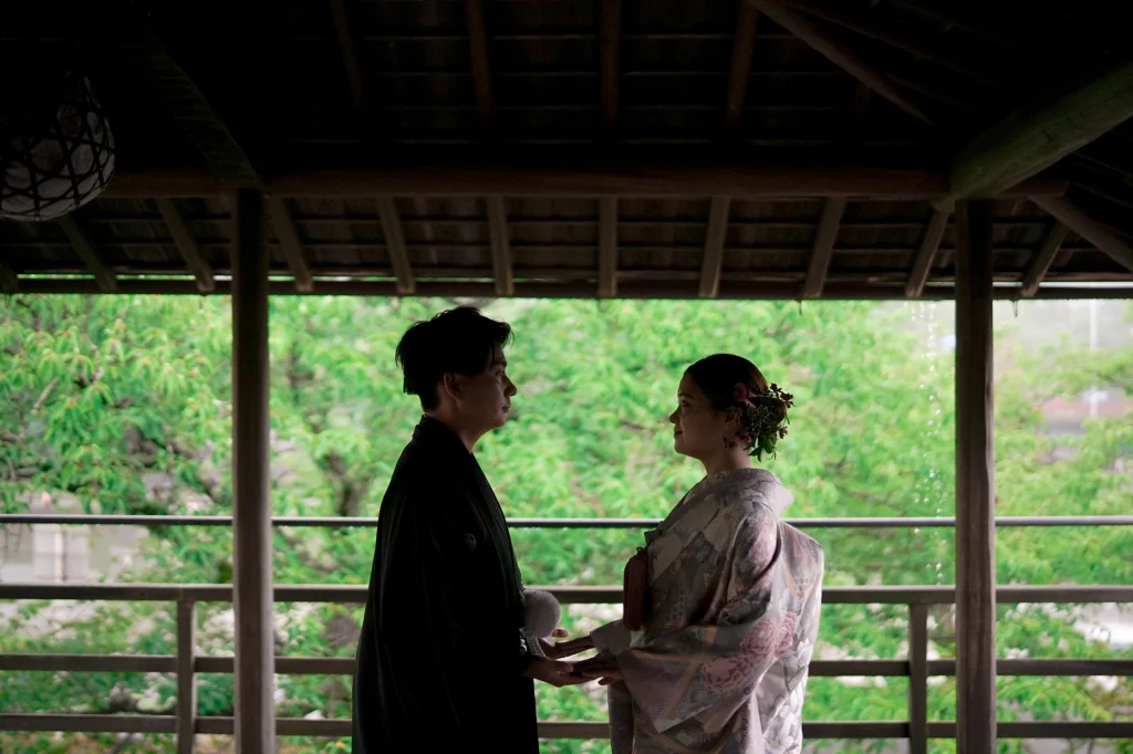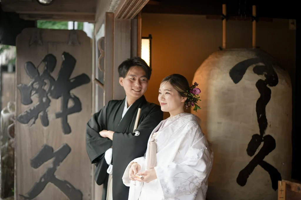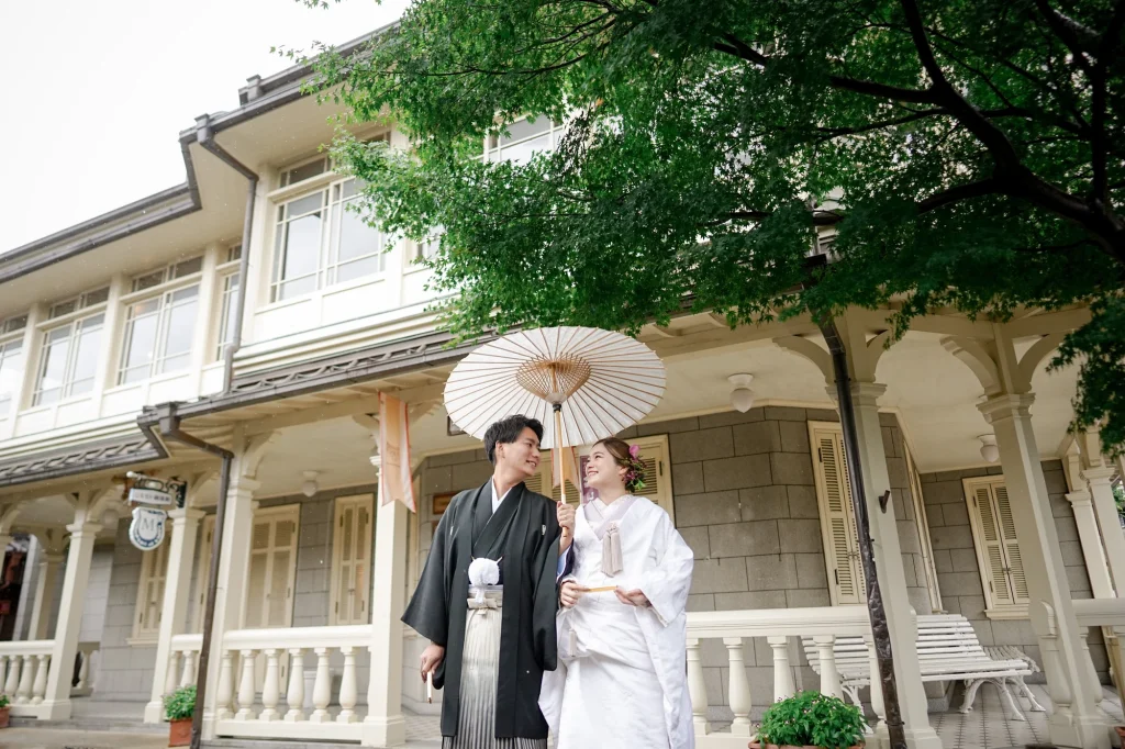 関東からお越しのおふたりは、東京での結婚式前に、思い出の場所・三重県伊勢市で前撮りと伊勢神宮への入籍奉告参拝を実施。当日は雨模様でしたが、雨粒をまとったしっとりとした空気がかえって写真に深みを与え、おふたりの元気で笑顔あふれる姿が一層際立ちました。まずは大好きなおかげ横丁での前撮り。江戸・明治期の情緒ある町並みを背景に、観光客からも祝福される中、和装も洋装も自然体の笑顔で撮影。町全体が祝福ムードに包まれました。その後、神聖な境内で執り行われた伊勢神宮内宮での入籍奉告参拝は、日本人の“心のふるさと”である伊勢神宮ならではの癒しと格式を感じられる儀式です。雨の日でも、自然の緑と雨のしずくが織り成す穏やかで神秘的な雰囲気が、おふたりの節目をより静かに美しく演出しました。和装前撮りや、天候を味方にするロケーション撮影、そして伊勢神宮での奉告参拝を織り交ぜたこのプランは、「伊勢神宮 入籍奉告参拝」「おかげ横丁 前撮り」「雨の日 前撮り 和装」といったキーワードで検索するカップルにぜひおすすめです