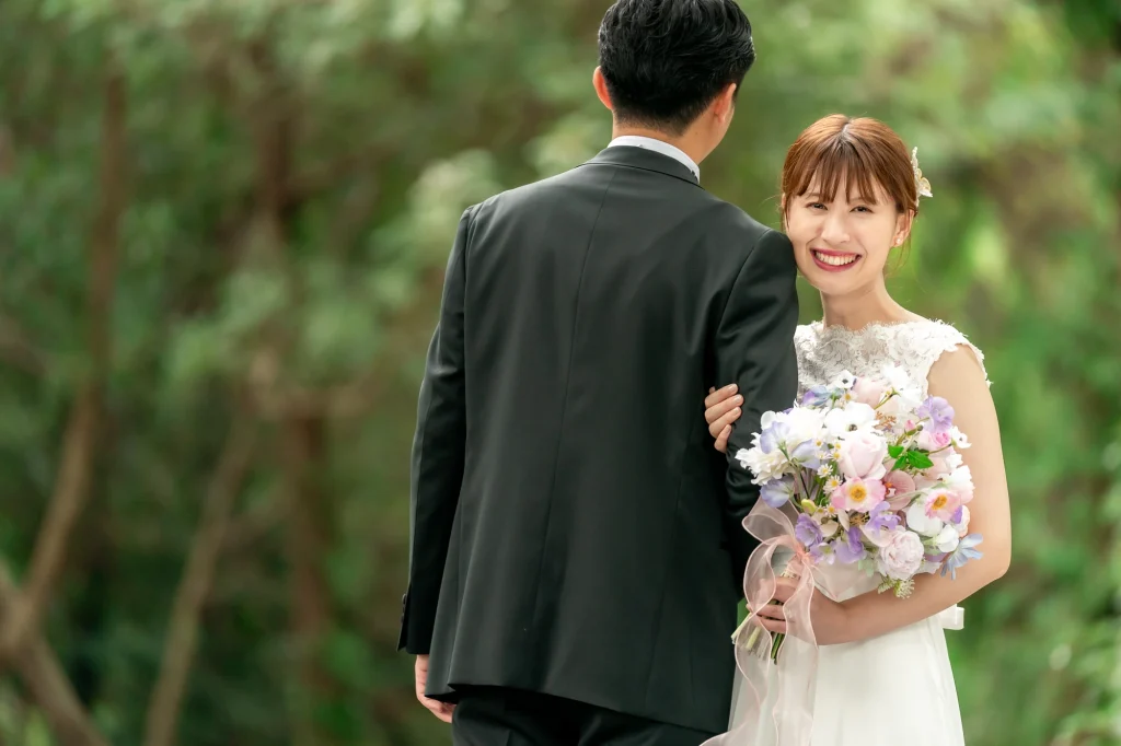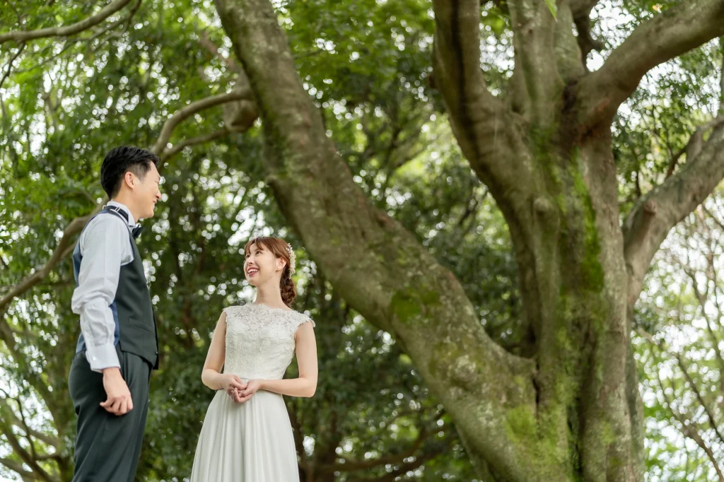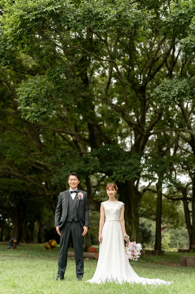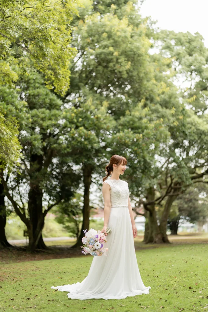 和装は趣ある和館で、ドレスは自然に囲まれたガーデンで――そんな理想を叶えたおふたりのフォトウエディングは、伊勢市二見の歴史的建造物「賓日館」と、伊勢市内の自然豊かな公園で撮影を行いました。白無垢とウエディングドレス、どちらも「純潔」や「新たな生活のスタート」を象徴する白を基調とし、花嫁の純真無垢な美しさを引き立ててくれます。和装では、洋髪スタイルでも綿帽子を合わせていただくことが可能で、伝統とモダンを融合させたスタイルが魅力的でした。格式ある和の空間でしっとりとした撮影を行った後は、開放感あふれるガーデンでナチュラルな表情を引き出す撮影に。異なる雰囲気を一度に楽しめるこのロケーションプランは、和装も洋装も大切にしたいカップルにぴったりです。伊勢の魅力を活かしたフォトウエディングで、一生に残る思い出をかたちにしませんか?