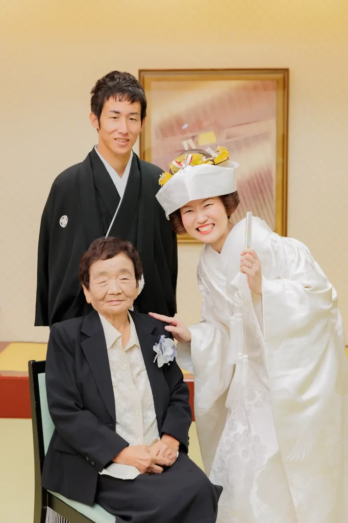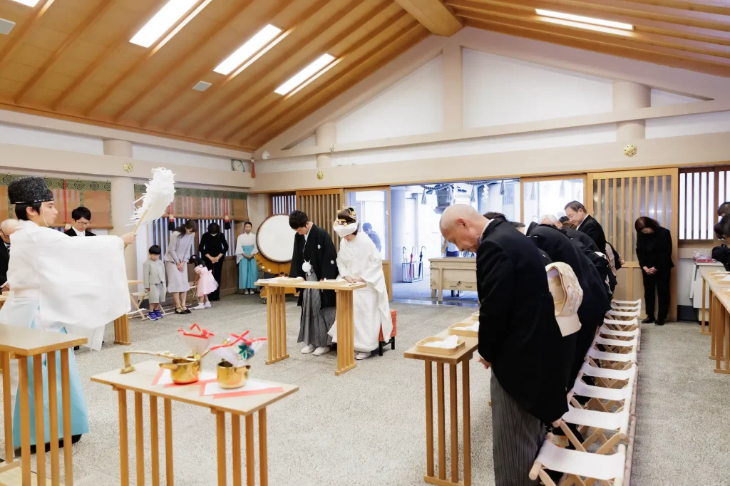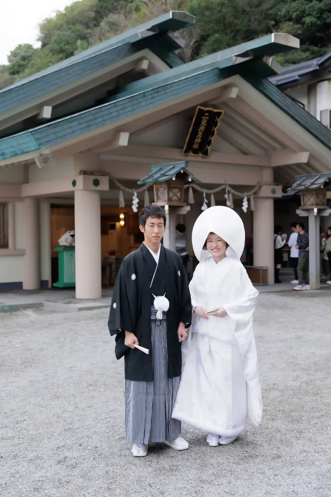 当日は、美しい海と夫婦岩に見守られながら、厳かで心に残る神前式が執り行われました。新郎新婦様の晴れ姿をご高齢のおばあさまにも直接ご覧いただくことができ、スタッフ一同も心から嬉しく感じた一日でした。