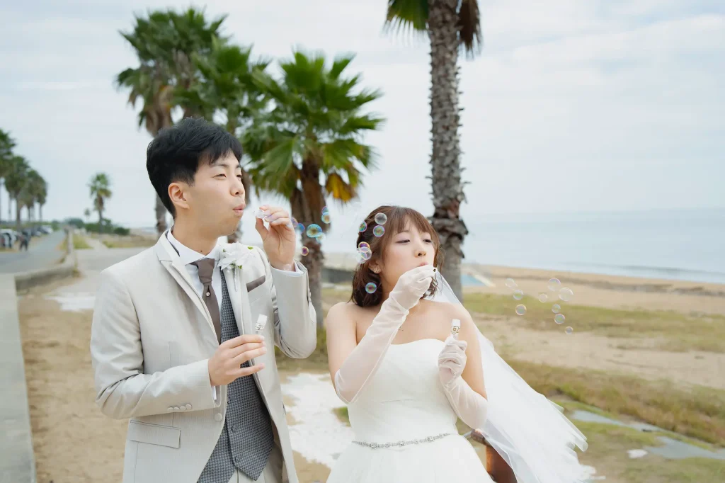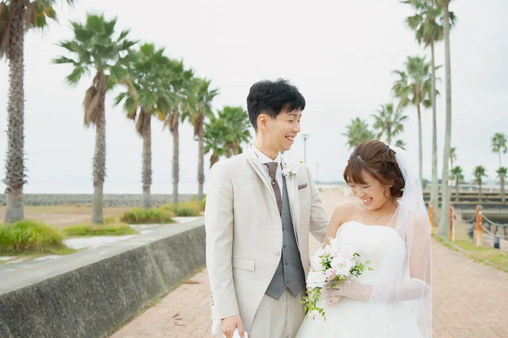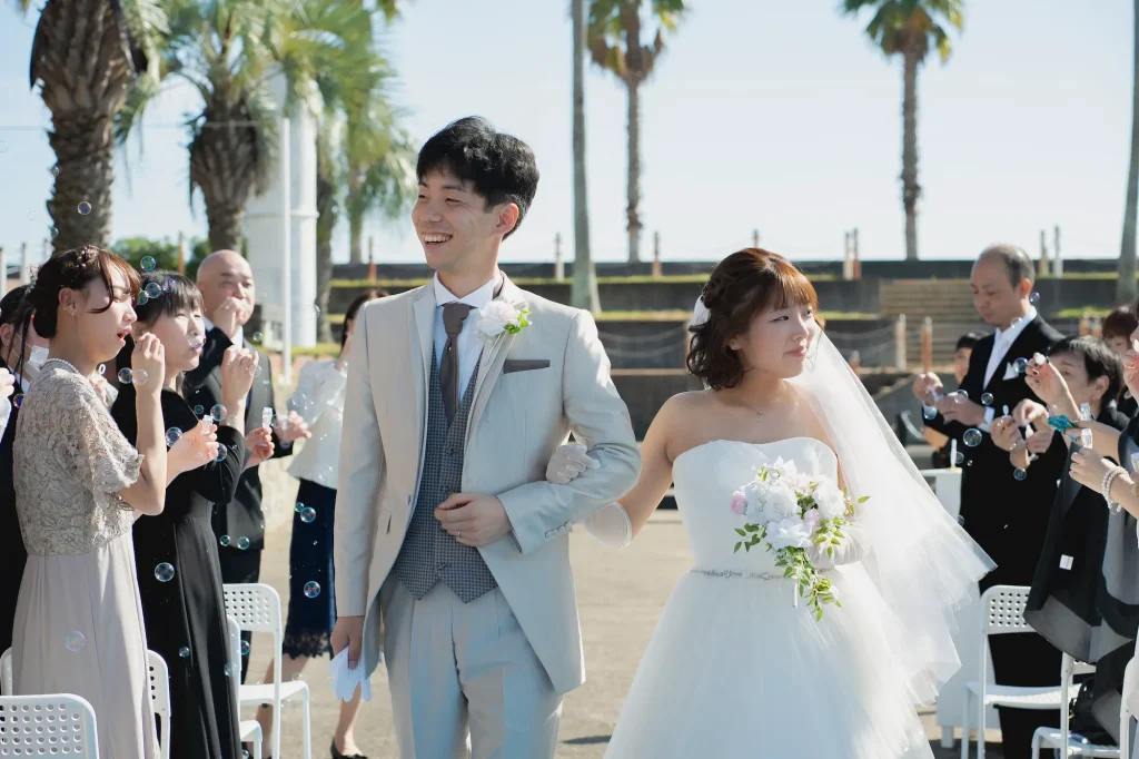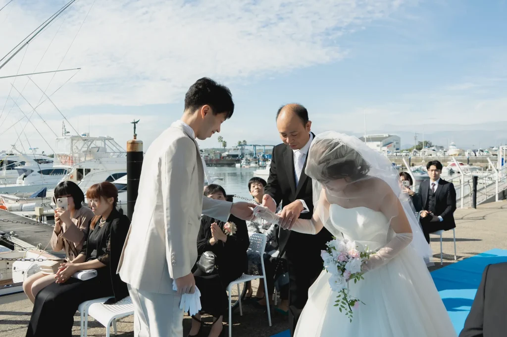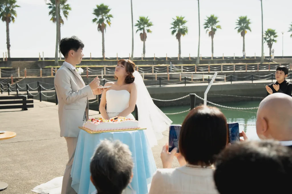 伊勢湾を望む開放的なロケーションが魅力の「マリーナ河芸」にて、屋外ウエディングをプロデュースさせていただきました。ヤシの木が並ぶ南国リゾートのような雰囲気の中で行われたお式は、まさに非日常そのもの。青空の下、おふたりの晴れ姿がより一層輝いて見えました。挙式の中には、ファーストバイトやサンクスバイトなど、おふたりならではの演出を取り入れ、笑顔と感動があふれる時間に。ご家族やご友人と共に過ごすひとときは、とても温かくアットホームな雰囲気に包まれていました。そして挙式後には、ゲストの皆さまと一緒にバーベキューを楽しむというマリーナ河芸ならではの演出も!潮風を感じながら、美味しいお料理と会話に花が咲き、最後まで笑顔が絶えない一日となりました。自然の中で叶える自由なスタイルの結婚式が、おふたりの特別な思い出になったことと思います。