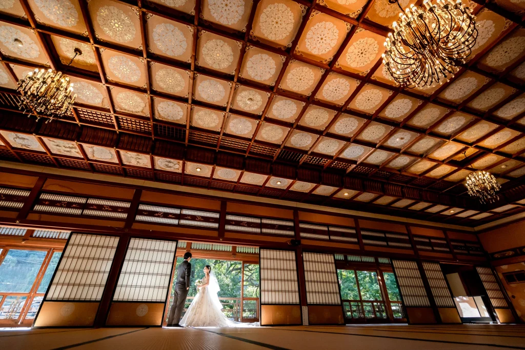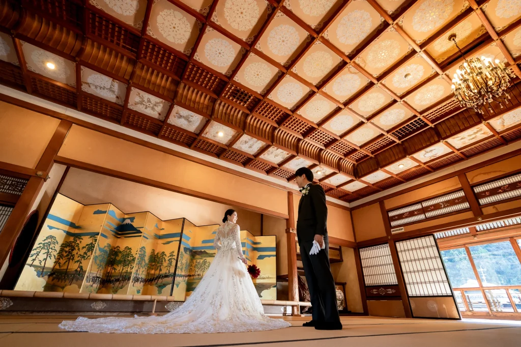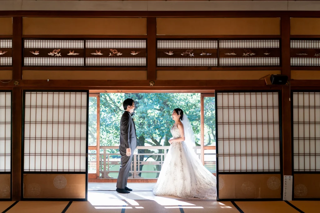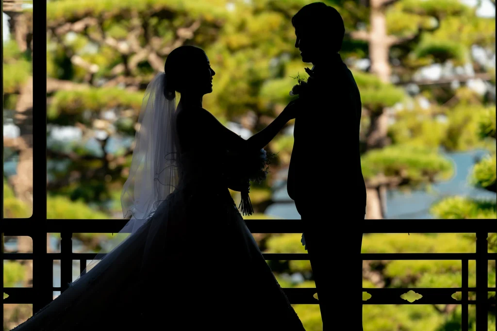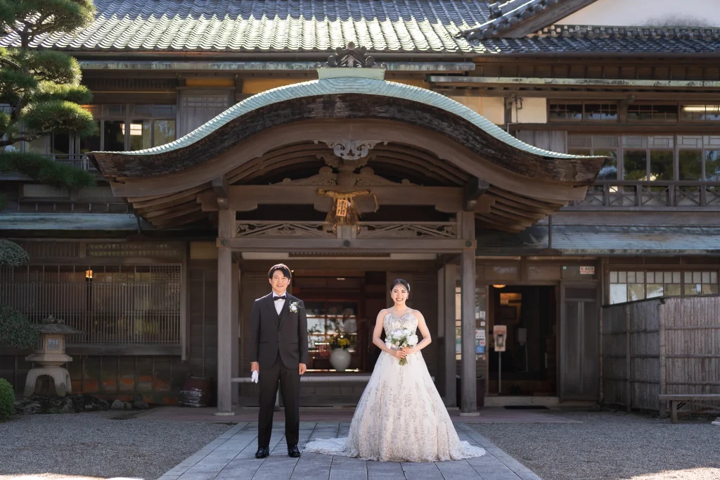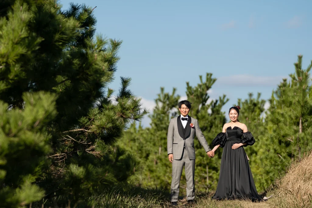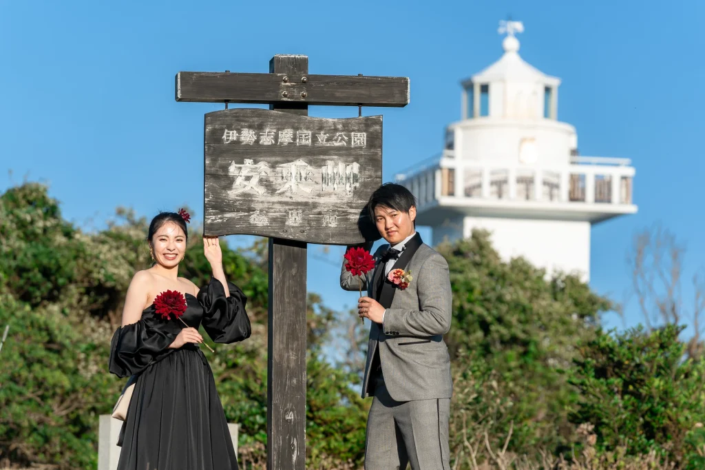 伊勢市二見町の歴史ある賓日館にて、憧れの桂由美のウエディングドレスでの撮影から始まったおふたりの特別な一日。重厚感あふれるクラシカルな空間に、エレガントなドレスが美しく映え、まるで映画のワンシーンのような写真に仕上がりました。その後は志摩市へ移動し、国府の浜と安乗岬でリゾートフォトを。青い空と広がる海、輝く白砂のロケーションが、おふたりの笑顔を一層引き立てます。海風に包まれながらのナチュラルなカットや、夕暮れ時のロマンティックなシルエット写真など、おふたりのこだわりと個性が詰まった撮影となりました。伊勢志摩エリアならではの多彩なロケーションを活かした一日は、おふたりにとっても私たちスタッフにとっても、忘れられない一日になりました。