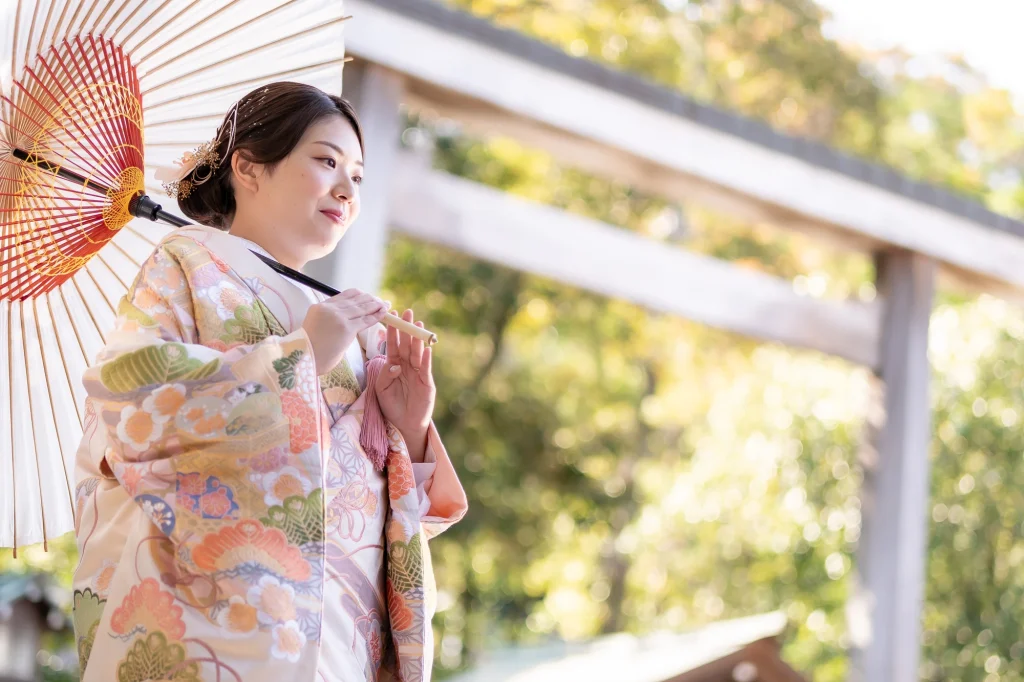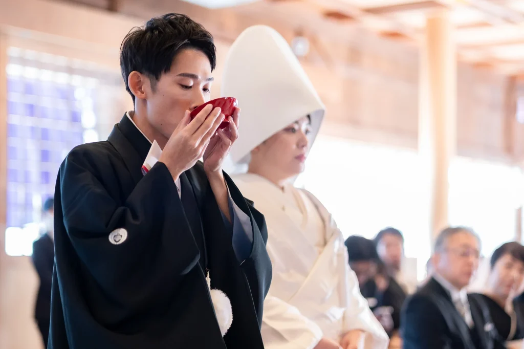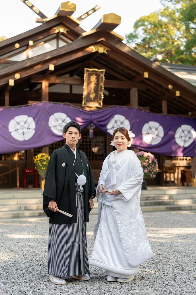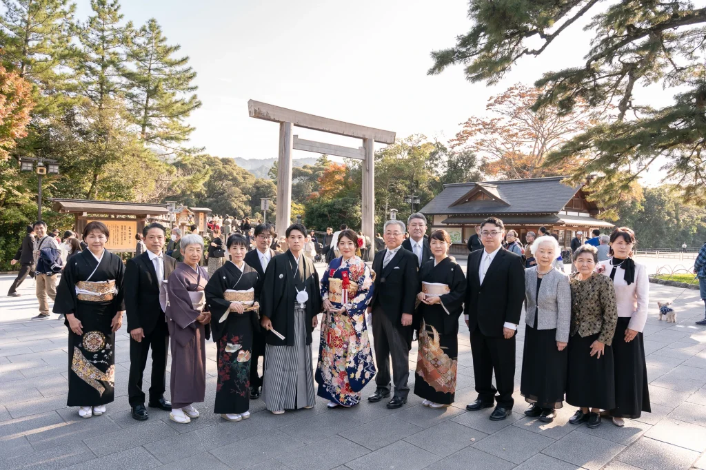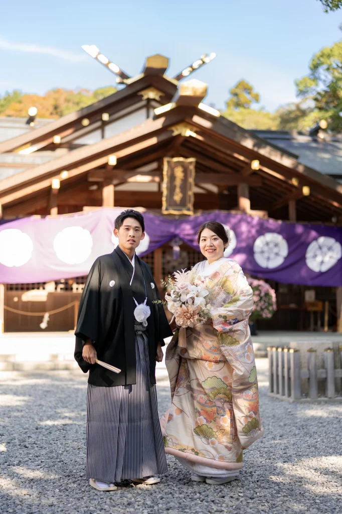 伊勢市のみちひらきの神・猿田彦神社にて、厳かに執り行われた神前式。新婦様は白無垢に身を包み、凛とした美しさでご家族やご友人に見守られながら永遠の誓いを交わされました。挙式後は同神社の披露宴会場にて、ご友人を中心とした賑やかで温かな披露宴が行われ、おふたりらしい演出が随所に散りばめられたこだわりの一日となりました。お色直しでは華やかな色打掛にお召し替えされ、ゲストの皆様から大きな拍手が送られました。結びには伊勢神宮内宮へと向かい、振袖姿で結婚奉告のご参拝。格式ある伊勢の地で、和装に包まれたおふたりの姿はまさに理想の和婚。伊勢神宮・猿田彦神社での結婚式は、日本の伝統を大切にしながらも、おふたりらしさを表現できる特別な一日になります。