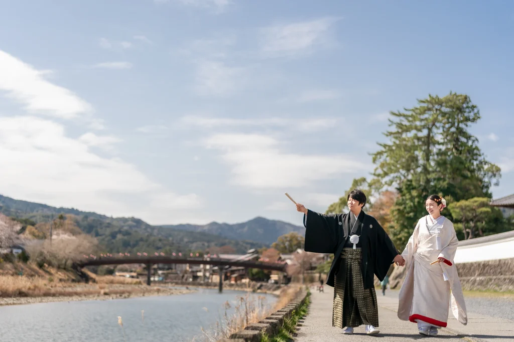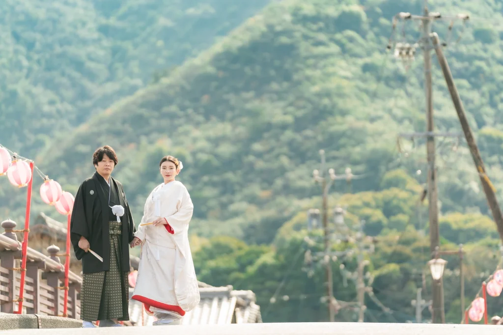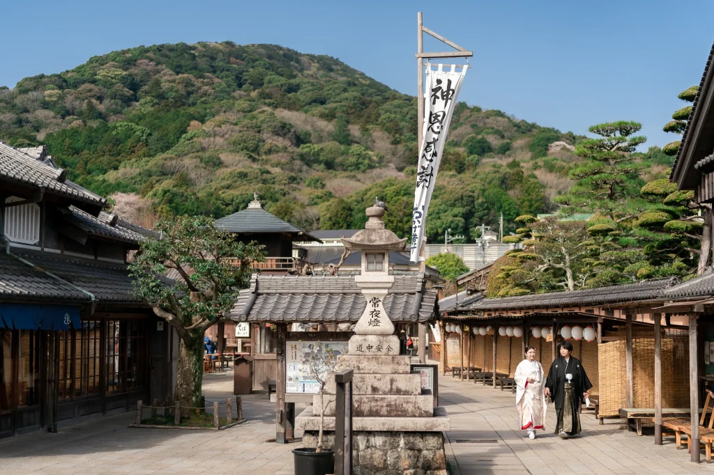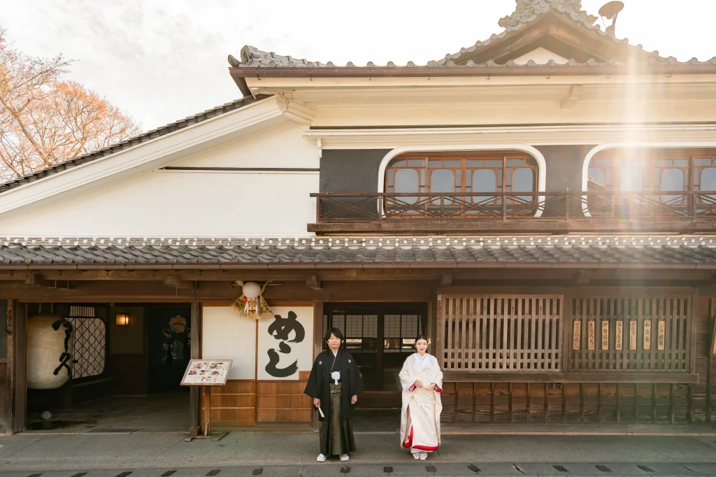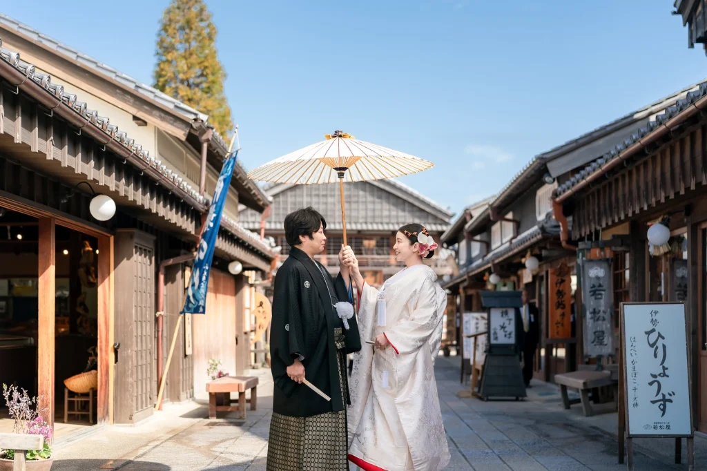 結婚式の1ヶ月前、おふたりは三重県伊勢市にある人気観光地「おかげ横丁」にて、念願の桜の前撮りを行いました。伊勢神宮のお膝元に広がるおかげ横丁は、江戸から明治期の風情ある建築が残る、三重を代表する観光スポット。その歴史情緒あふれる町並みに、花嫁様の白無垢姿が美しく映え、まるで時代を超えたワンシーンのような撮影が叶いました。桜の季節にこだわって日程を調整されたおふたりの想いが詰まった前撮りは、和婚ならではの魅力に満ちた特別な時間に。満開の桜と、伊勢路の伝統建築、そして白無垢の上品な佇まいが調和し、ご家族やご友人にも好評だったそうです。伊勢での和婚をご検討中の方や、和装の前撮りをお考えの方にとって、春の「おかげ横丁 桜前撮り」は特におすすめのロケーションです。
